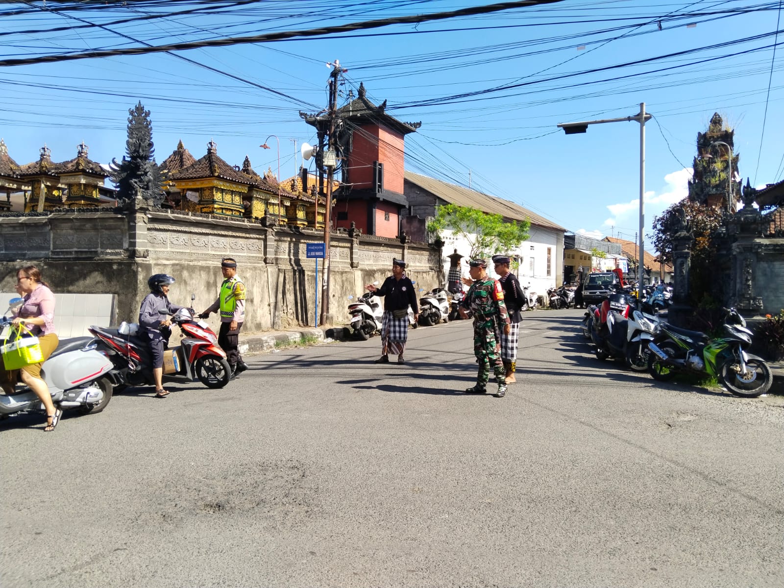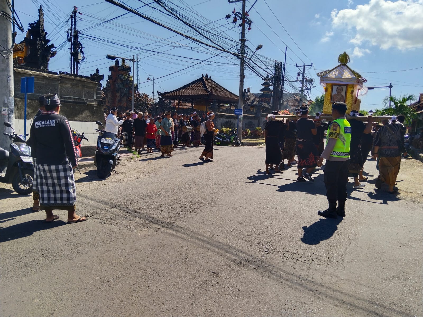 Bhabinkamtibmas, dan Pecalang berkolaborasi melakukan pengaturan arus lalu lintas di titik-titik persimpangan guna mencegah terjadinya kemacetan serta memastikan keselamatan para pelayat dan pengguna jalan lainnya.