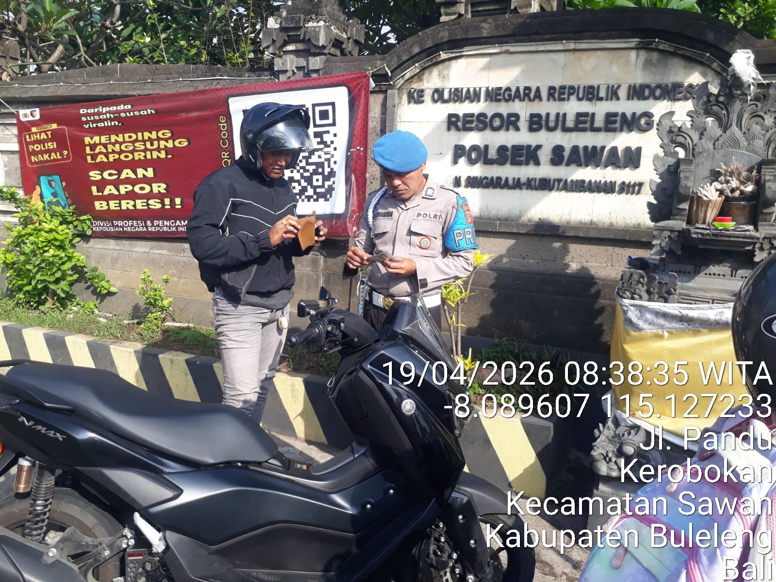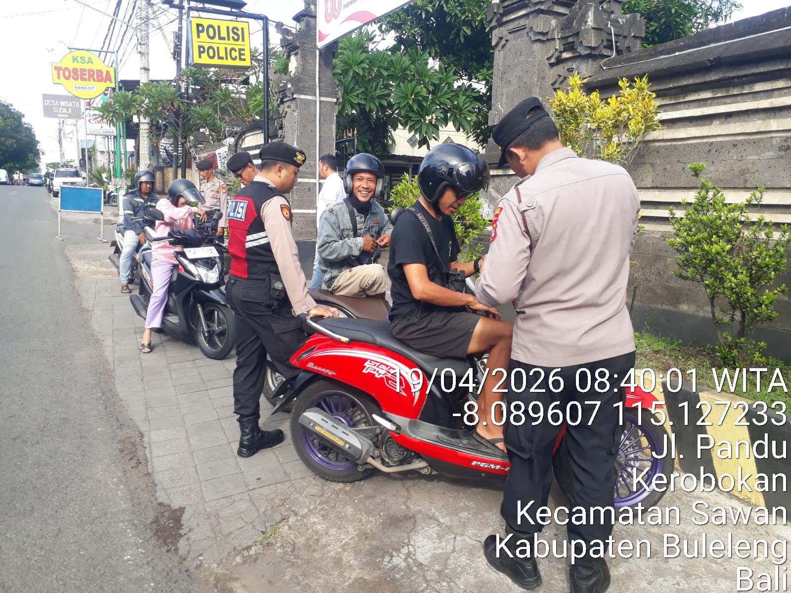 Kegiatan yang dimulai pukul 08.30 WITA tersebut berlangsung di Jalan Raya Sangsit–Singaraja, tepatnya di depan Mako Polsek Sawan. Razia dipimpin oleh Pawas AIPTU KdK Sudarmawan bersama enam personel jaga.