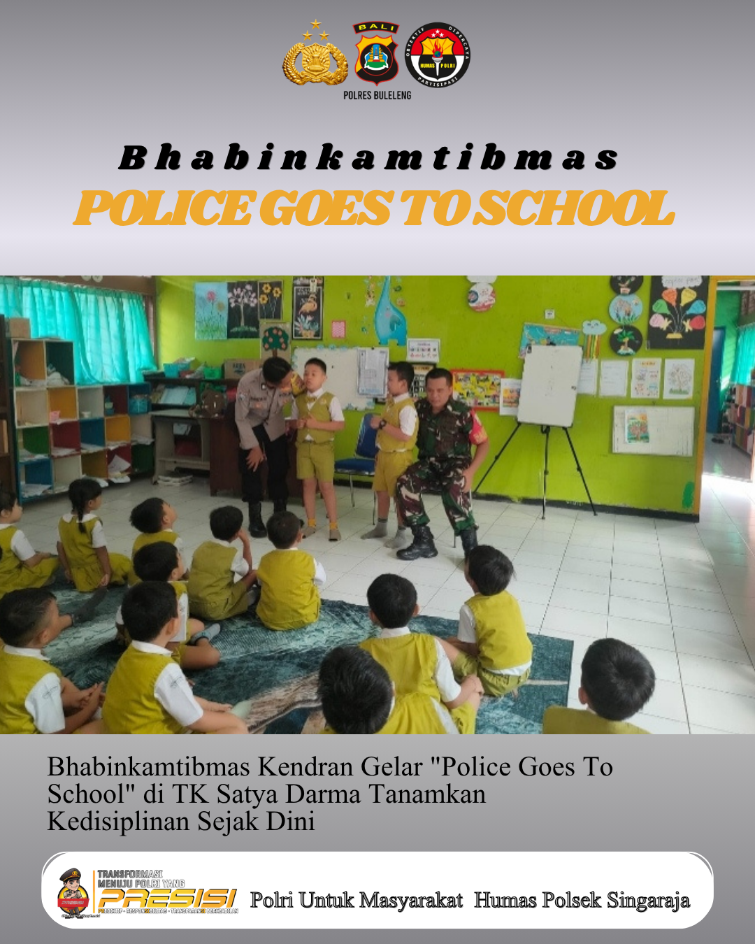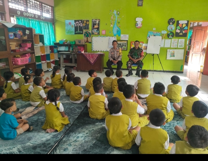 BULELENG – Keceriaan terpancar dari wajah siswa-siswi TK Satya Darma, Kelurahan Kendran, saat menerima kunjungan istimewa dari aparat keamanan pada Selasa pagi (14/04/2026). Melalui program Police Goes To School, Bhabinkamtibmas dan Babinsa hadir untuk memberikan edukasi karakter dan keselamatan bagi anak-anak usia dini.