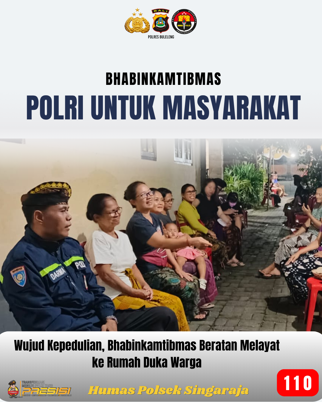 SINGARAJA – Kehadiran Polri di tengah masyarakat tidak hanya saat menjaga keamanan, tetapi juga dalam suasana duka sebagai bentuk empati dan persaudaraan. Pada Minggu malam, 19 April 2026, pukul 20.00 WITA, Bhabinkamtibmas Kelurahan Beratan, Aiptu Ketut Darma Sucipta, S.Sos., melaksanakan kegiatan sambang sekaligus melayat ke rumah duka salah satu warga binaannya.